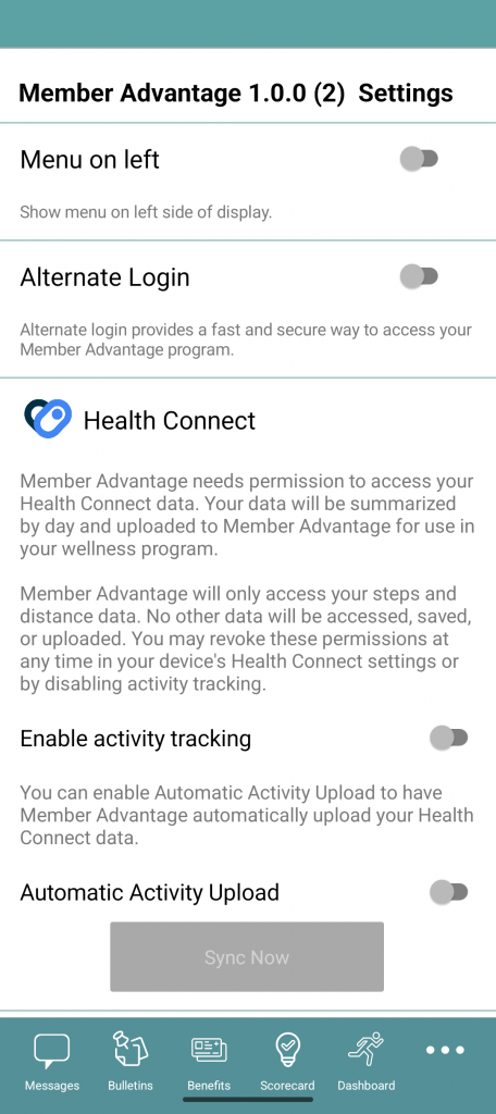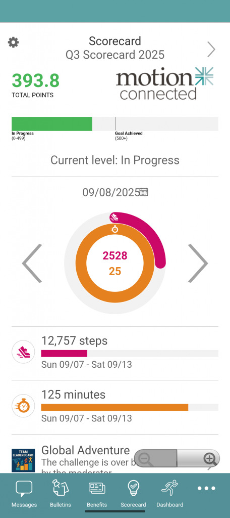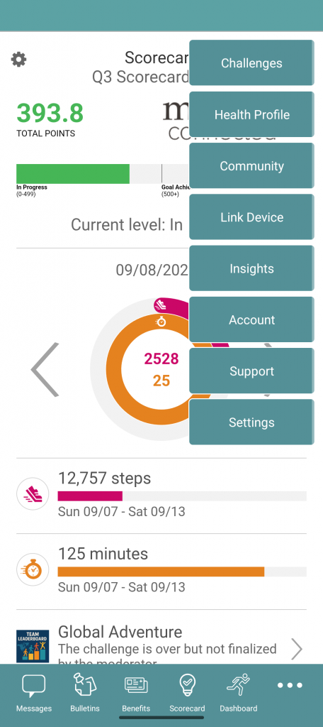 After you login, the app will present you with a wellness dashboard or message board, depending on what services to which your organization subscribes.